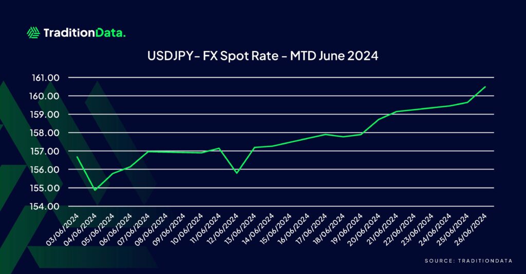 However, on June 14th, the yen weakened further after the central bank left monetary policy unchanged and delayed providing details on when the bond purchase slowing would begin. The next policy meeting is scheduled for the end of July. BOJ Governor Ueda’s dovish comments, stating that recent inflation projections were not reaching the desired 2% target, also influenced the decision to maintain the current policy. Throughout the month, the Yen has seen a steady decline.